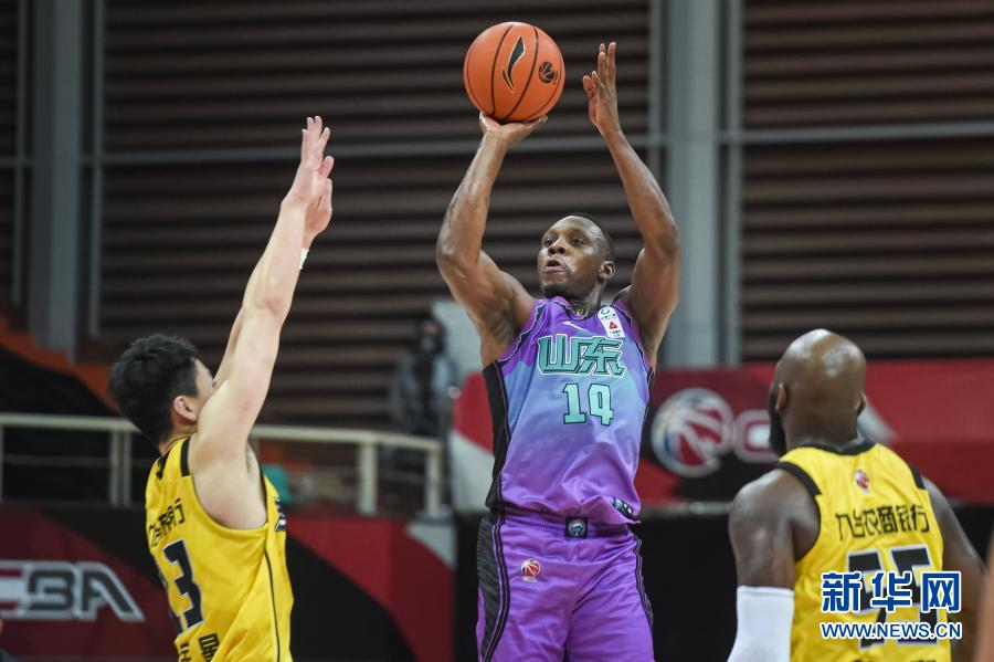 3月17日,山东西王队球员哈德森(中)在比赛中投篮。