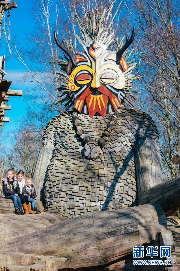 3月20日,孩子们在比利时博姆市的德舒尔森林公园与“巨人”雕塑合影。新华社记者 张铖 摄