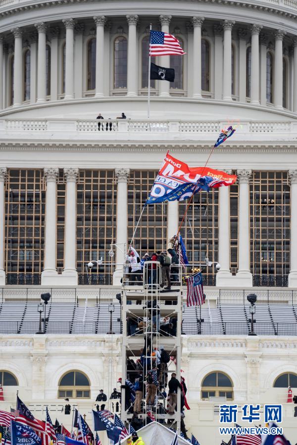 2021年1月6日,在美国华盛顿的国会大厦前,特朗普的支持者爬上用于总统就职典礼的媒体拍摄高台。新华社记者 刘杰 摄