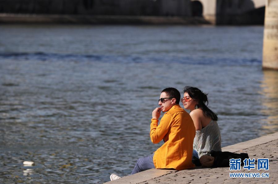 3月24日,一对情侣在法国巴黎塞纳河畔晒太阳。 当日,法国巴黎天气晴好,一些民众在遵守防疫规定的前提下走出家门,享受春日阳光。新华社记者高静摄