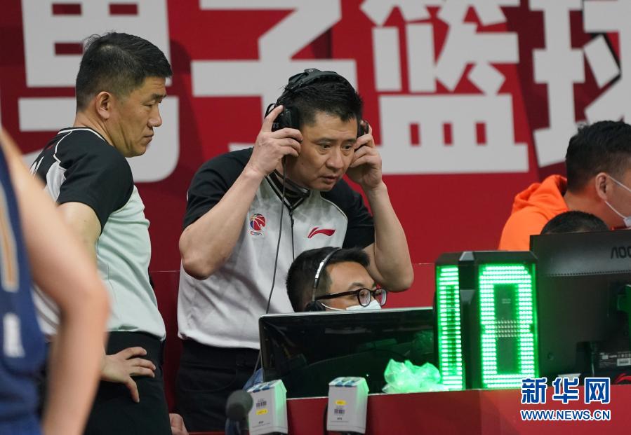 3月24日,主裁判宋晓竞(中)在比赛中回看录像。 当日,在浙江诸暨举行的2020-2021赛季中国男子篮球职业联赛(CBA)第四阶段第48轮比赛中,南京同曦宙光队以109比124不敌时代中国广州队。 新华社记者 孟永民 摄