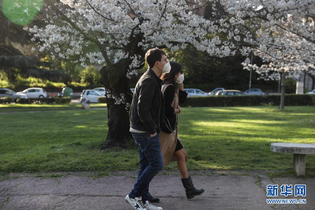 3月24日,佩戴口罩出行的市民从意大利首都罗马盛开的樱花树下走过。新华社记者 程婷婷 摄 |
