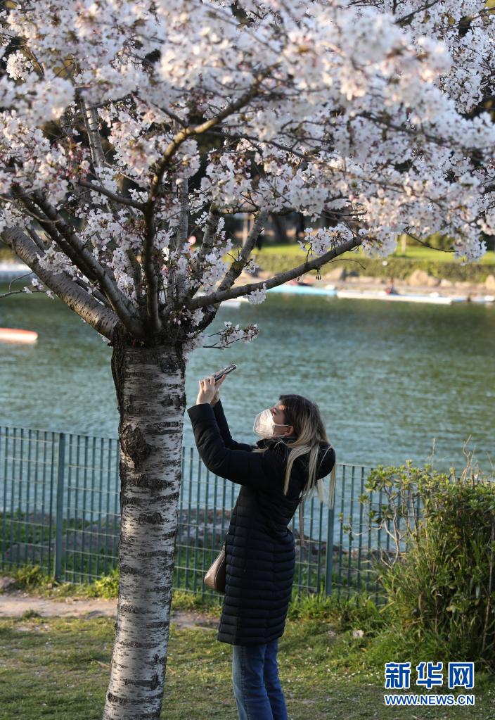3月24日,佩戴口罩出行的市民在意大利首都罗马一株盛开的樱花树下拍照。新华社记者 程婷婷 摄