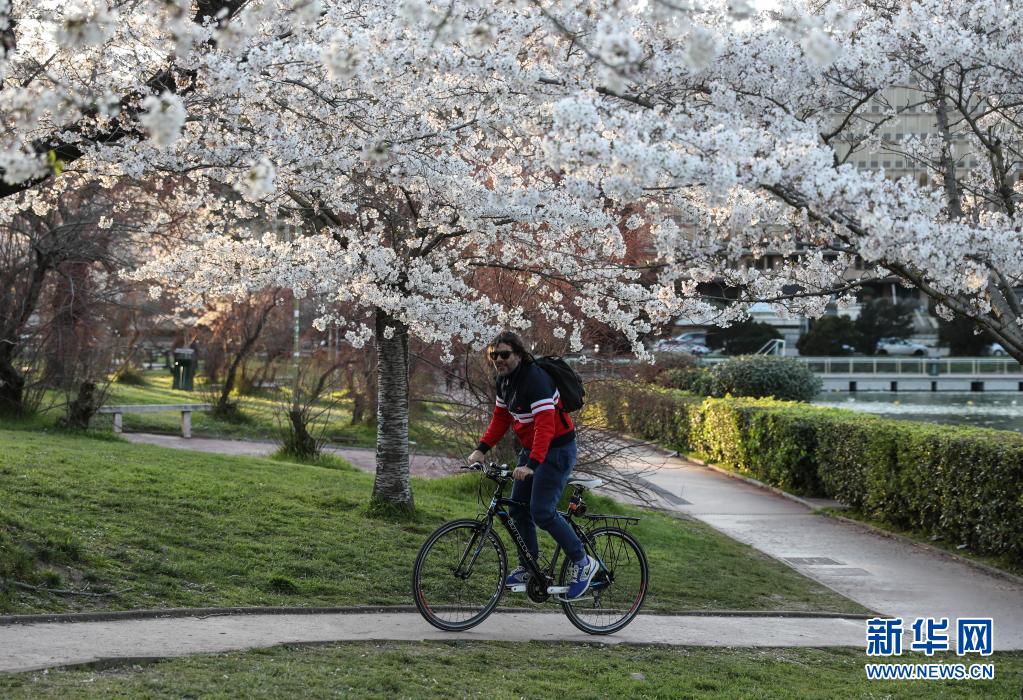 3月24日,市民骑车从意大利首都罗马盛开的樱花树下经过。新华社记者 程婷婷 摄