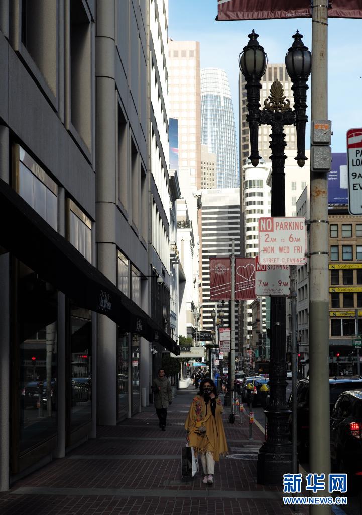 3月24日,行人从美国加利福尼亚州旧金山街头走过。 美国旧金山23日进入加州“紫、红、橙、黄”四级防疫层级中相对宽松的“橙色”等级。24日起,市内大部分商业活动可以在控制客流的前提下重新开放。 新华社记者 吴晓凌 摄