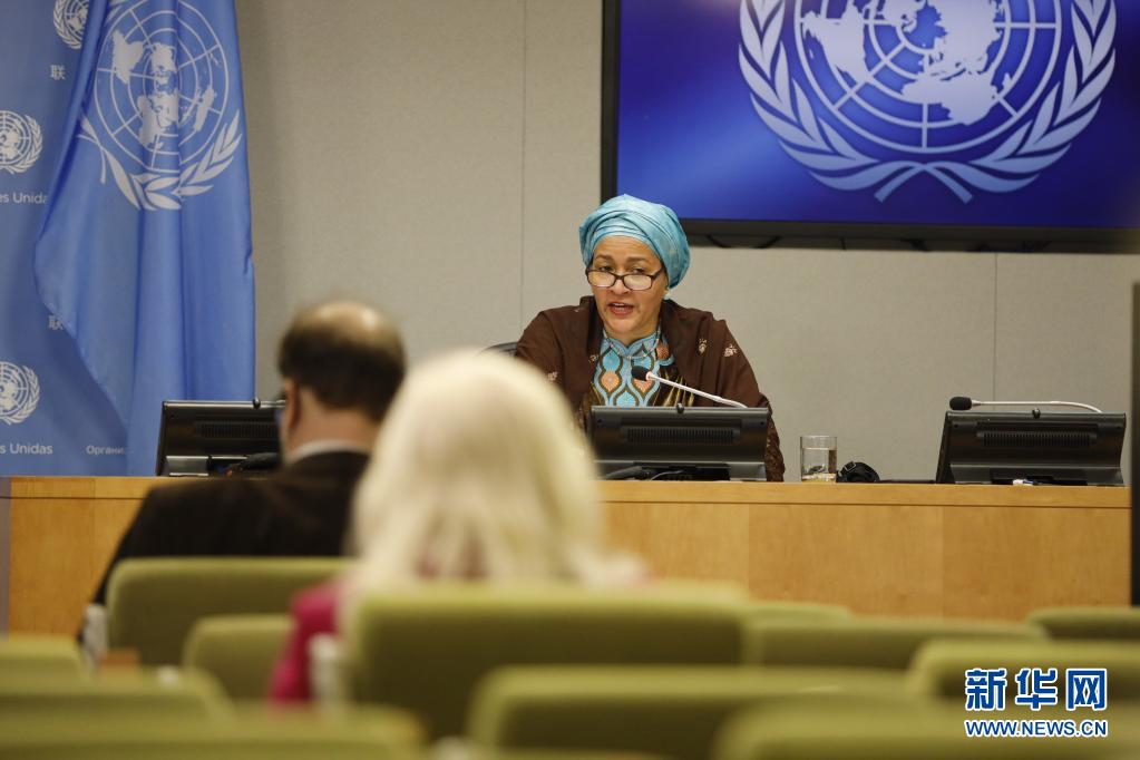 3月25日,联合国常务副秘书长阿明娜·穆罕默德在纽约联合国总部举行的记者会上发言。