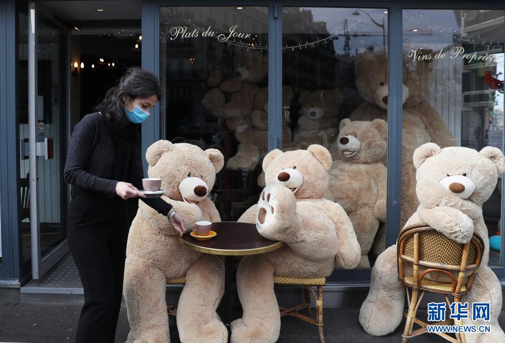 当天,一群憨态可掬的超大号泰迪熊“占领”了没有顾客的餐馆、咖啡馆,四仰八叉“享受”咖啡、香槟和暖阳。据报道,这些泰迪熊均由在巴黎经营书店的菲利普·拉布雷尔提供。他2018年10月开始把这些毛绒玩具借给很多地方摆放,新冠疫情以来也没有间断,给路过的人们带来笑容。拉布雷尔说,他在去年疫情暴发后买了更多泰迪熊,用于装点市容。受新冠疫情影响,法国的餐馆、咖啡馆、酒吧等公共场所自去年10月底一直关闭至今,只能提供外卖服务。