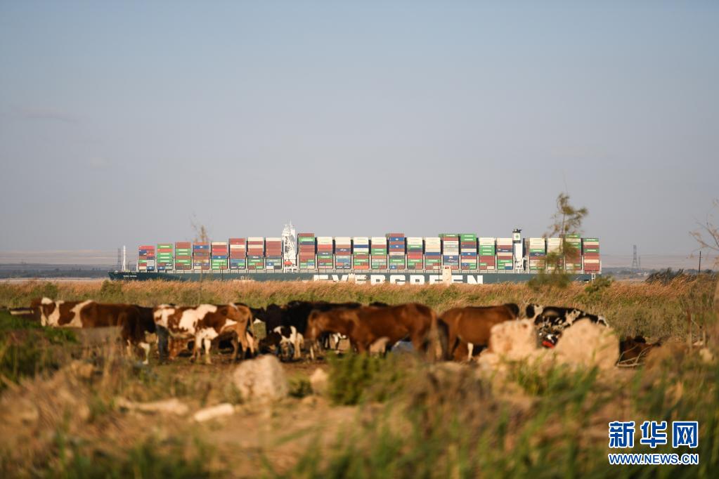 这是3月29日拍摄的移动至埃及苏伊士运河正常航道上的重型货轮。