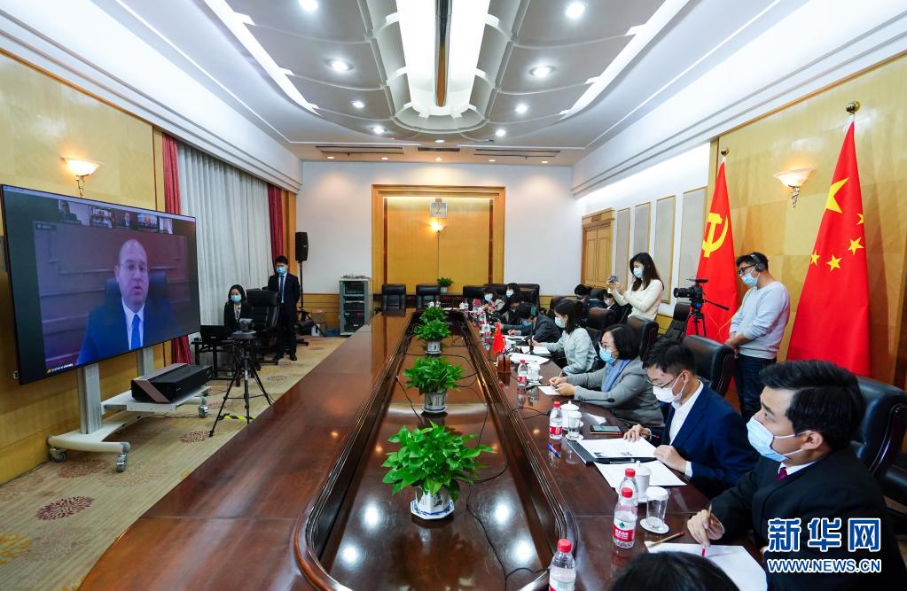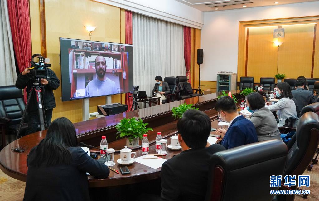 3月30日,记者在北京通过视频连线采访有关外宾。新华社记者 陈晔华 摄 新华社北京3月30日电 由中共中央对外联络部主办的中国-阿拉伯国家青年政治家论坛30日以视频会议方式举行。来自17个阿拉伯国家的60多个政党和政治组织的领导人及青年政治家、青年代表等参加。 中联部部长宋涛在开幕式中表示,创立中阿青年政治家论坛是落实习近平总书记同阿方领导人共识的重要举措,中国共产党愿同阿拉伯国家政党一道,促进青年交流沟通,传承双方传统友谊,深化各领域务实合作,共同反对一切针对中国和阿拉伯人民的霸权主义和压迫行径,推动构建中阿命运共同体。 巴勒斯坦法塔赫中央委员、总理阿什提耶等阿方政党领导人热烈祝贺中国共产党成立100周年,高度评价中国共产党带领中国人民开辟的成功发展道路,表示将继续坚定支持中方在涉疆、涉港等问题上的立场,期待与中国共产党加强治党治国经验互鉴,促进青年政治家之间的友好交往,推动阿中关系更好发展。