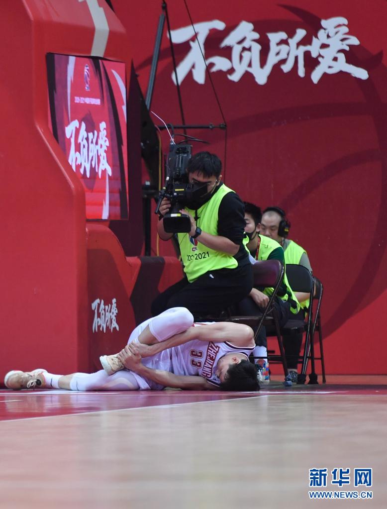 3月29日,浙江稠州金租队球员吴前(下)在比赛中受伤倒地,随后无法坚持比赛离场。