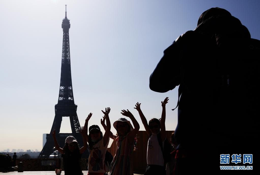 3月31日,一群孩子在法国巴黎特罗卡德罗广场与远处的埃菲尔铁塔合影留念。 法国总统马克龙3月31日宣布,法国将在本土所有地区执行封闭隔离措施,以遏制新冠疫情。 新华社记者 高静 摄