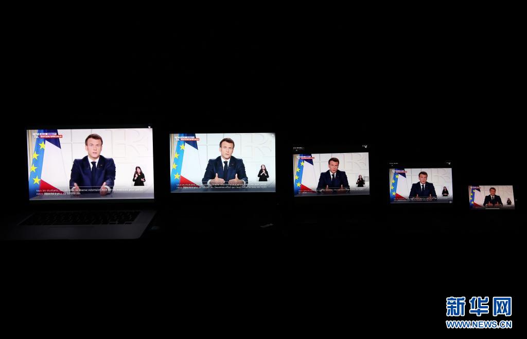 3月31日,在法国巴黎,屏幕上播放着法国总统马克龙发表全国电视讲话时的画面。 法国总统马克龙3月31日宣布,法国将在本土所有地区执行封闭隔离措施,以遏制新冠疫情。 新华社记者 高静 摄