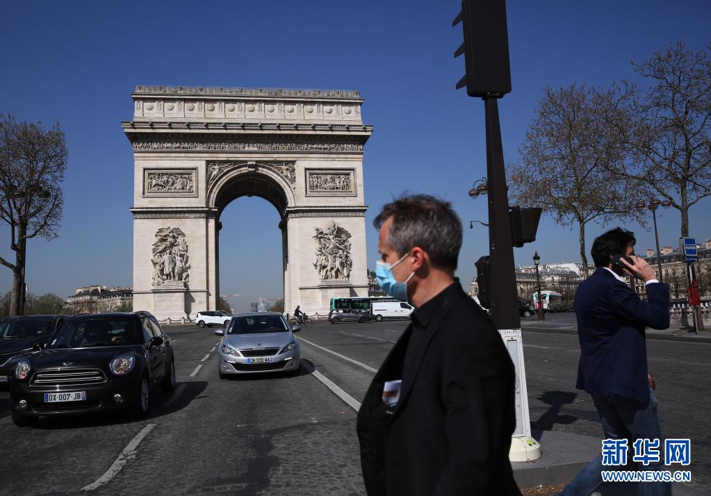 3月31日,人们走在法国巴黎凯旋门附近。 法国总统马克龙3月31日宣布,法国将在本土所有地区执行封闭隔离措施,以遏制新冠疫情。 新华社记者 高静 摄