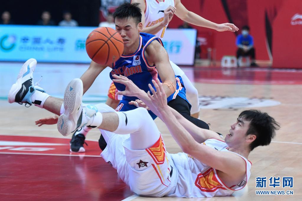 3月31日,深圳马可波罗队球员卢艺文(下)在比赛中倒地拼抢。 当日,在浙江诸暨举行的2020-2021赛季中国男子篮球职业联赛(CBA)第四阶段第51轮比赛中,深圳马可波罗队通过加时赛以114比106战胜四川五粮金樽队。 新华社记者黄宗治摄