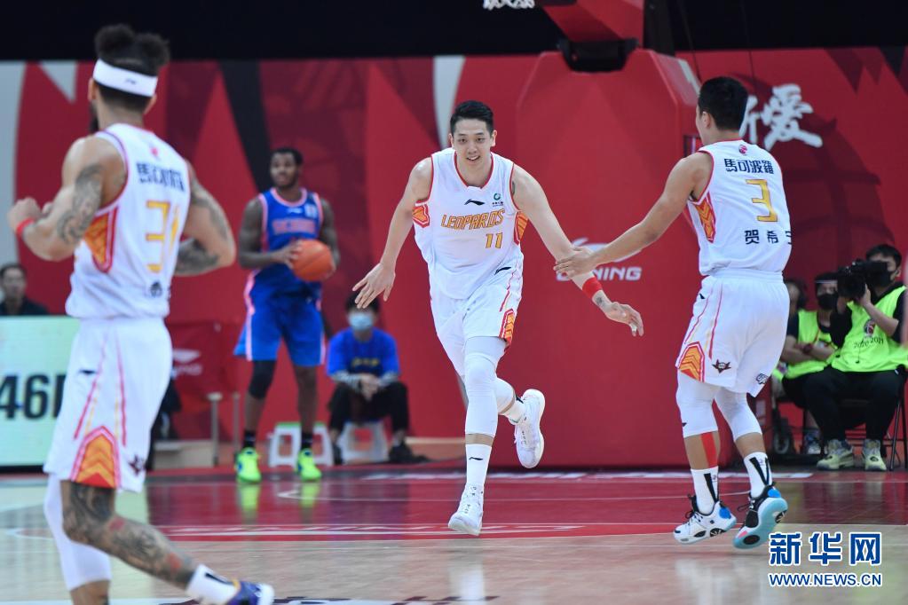 3月31日,深圳马可波罗队球员沈梓捷(中)在比赛中庆祝得分。 当日,在浙江诸暨举行的2020-2021赛季中国男子篮球职业联赛(CBA)第四阶段第51轮比赛中,深圳马可波罗队通过加时赛以114比106战胜四川五粮金樽队。 新华社记者黄宗治摄