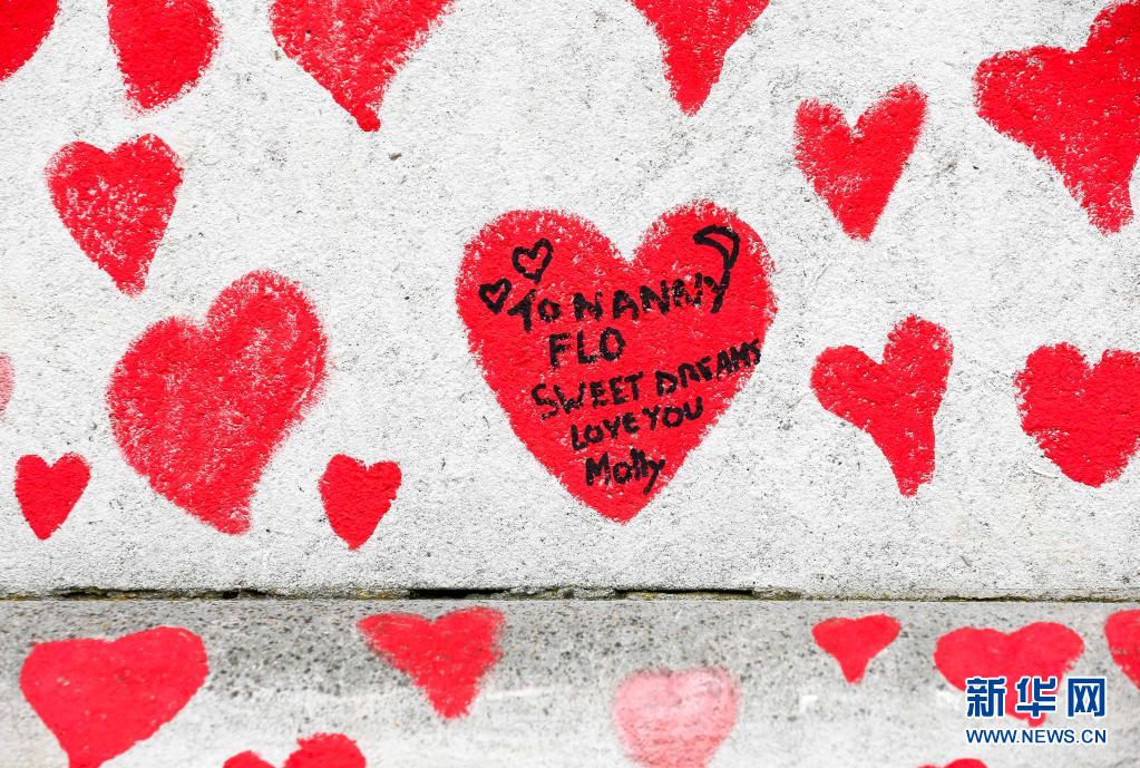 这是3月31日在英国伦敦拍摄的国家新冠纪念墙上红色的心和悼念的留言。