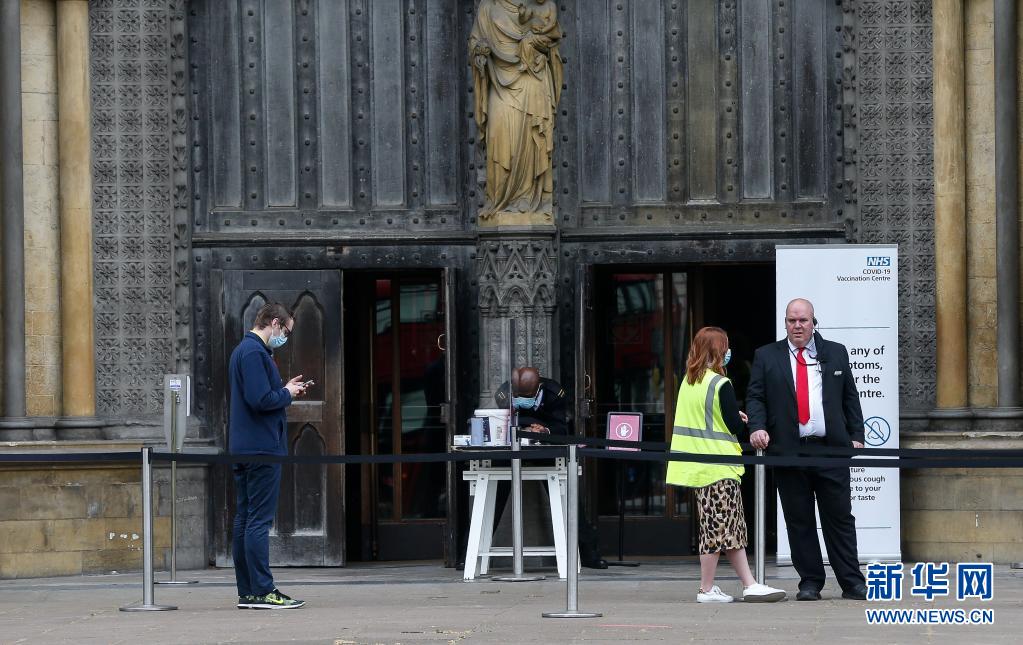 这是3月31日在英国伦敦拍摄的设立在威斯敏斯特教堂的新冠疫苗接种中心入口。