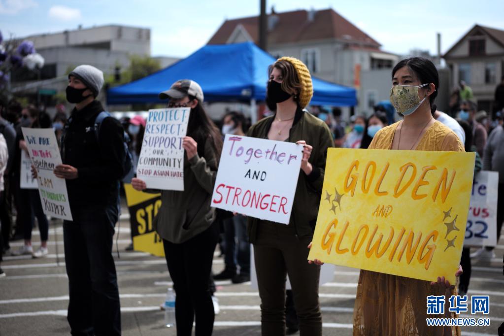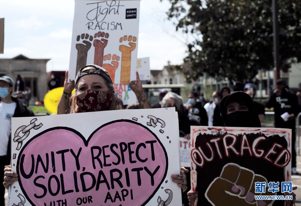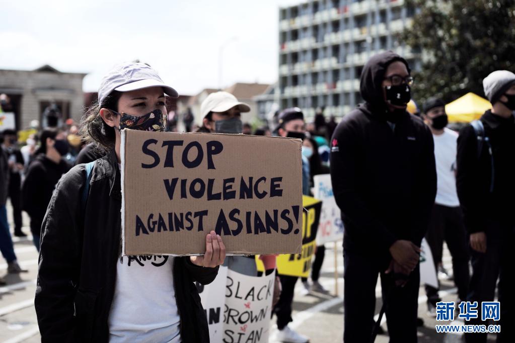 4月3日,在美国加利福尼亚州奥克兰,人们手举标语参加集会。 当日,美国加利福尼亚州旧金山湾区城市奥克兰民众举行集会抗议针对亚裔的歧视行为和仇恨犯罪。 新华社记者 吴晓凌 摄