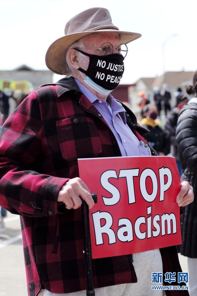 4月3日,在美国加利福尼亚州奥克兰,一名老人手持标语参加集会。 当日,美国加利福尼亚州旧金山湾区城市奥克兰民众举行集会抗议针对亚裔的歧视行为和仇恨犯罪。 新华社记者 吴晓凌 摄