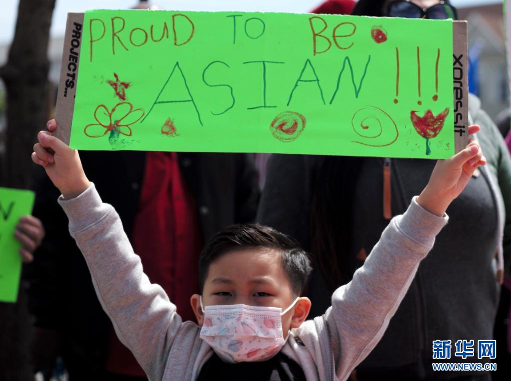 4月3日,在美国加利福尼亚州奥克兰,一名男孩手举标语参加集会。 当日,美国加利福尼亚州旧金山湾区城市奥克兰民众举行集会抗议针对亚裔的歧视行为和仇恨犯罪。 新华社记者 吴晓凌 摄