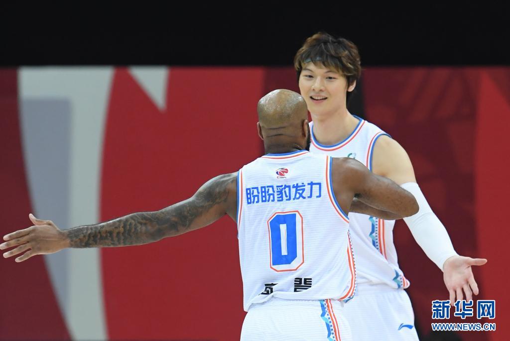 4月5日,福建豹发力队球员高登(左)和王哲林庆祝得分。