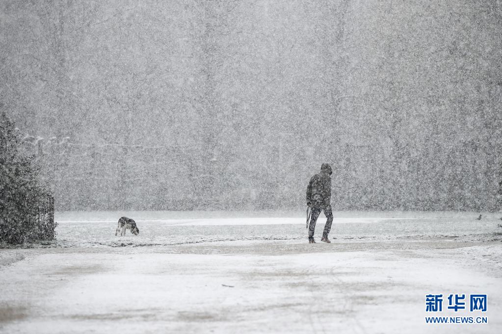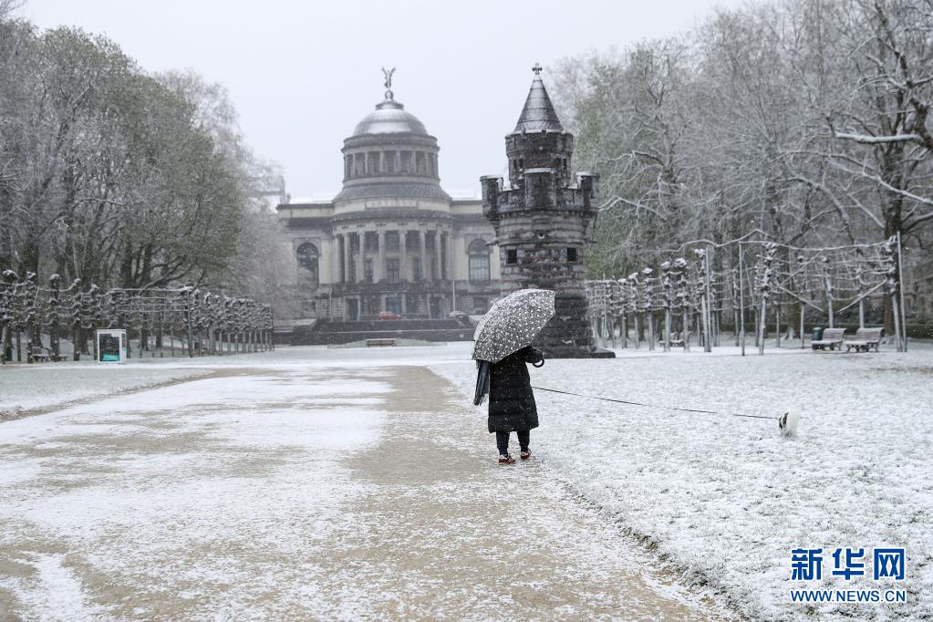 4月6日,一名市民在比利时布鲁塞尔五十周年纪念公园冒雪遛狗。 近日,比利时迎来降温降雪天气。春日大雪,景色蔚为壮观。 新华社记者 张铖 摄