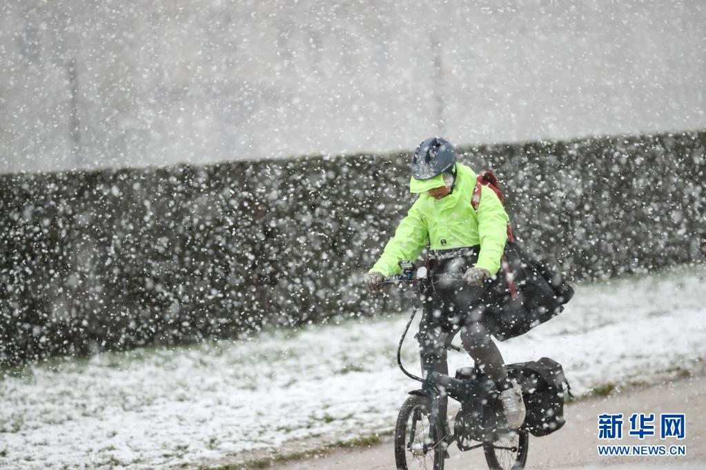 4月6日,一名市民在比利时布鲁塞尔五十周年纪念公园冒雪骑车。 近日,比利时迎来降温降雪天气。春日大雪,景色蔚为壮观。 新华社记者 张铖 摄