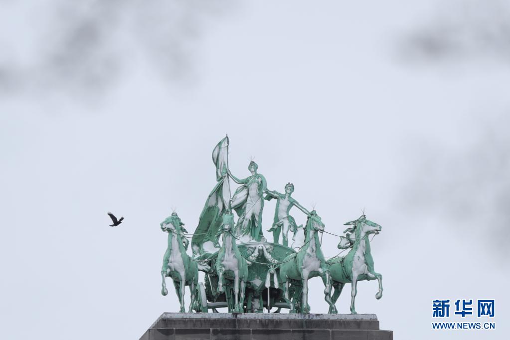 4月7日,比利时布鲁塞尔五十周年纪念公园中央拱门上的雕塑被积雪覆盖。