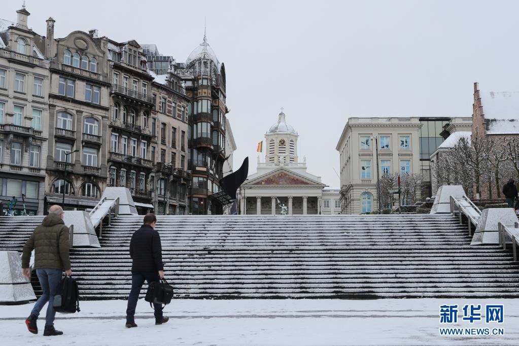 4月7日,行人走在比利时布鲁塞尔艺术山附近积雪的道路上。 比利时近日迎来春雪,首都布鲁塞尔银装素裹,景色别致。 新华社记者 郑焕松 摄