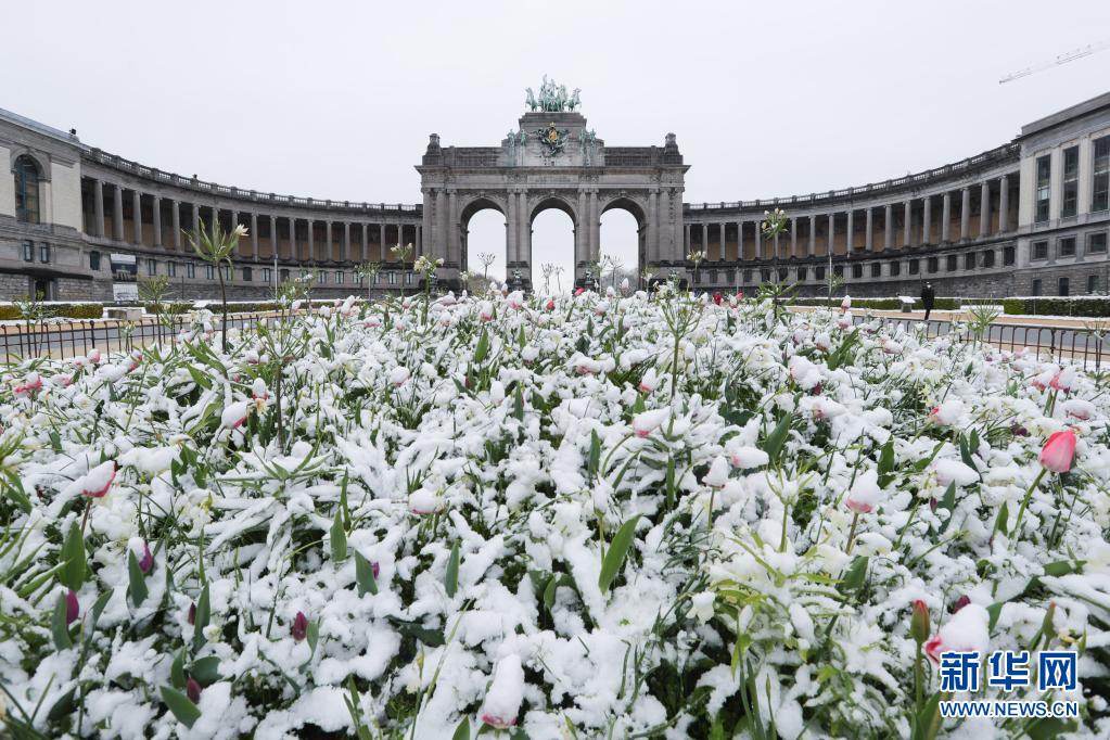 4月7日,比利时布鲁塞尔五十周年纪念公园的花朵被积雪覆盖。 比利时近日迎来春雪,首都布鲁塞尔银装素裹,景色别致。 新华社记者 郑焕松 摄