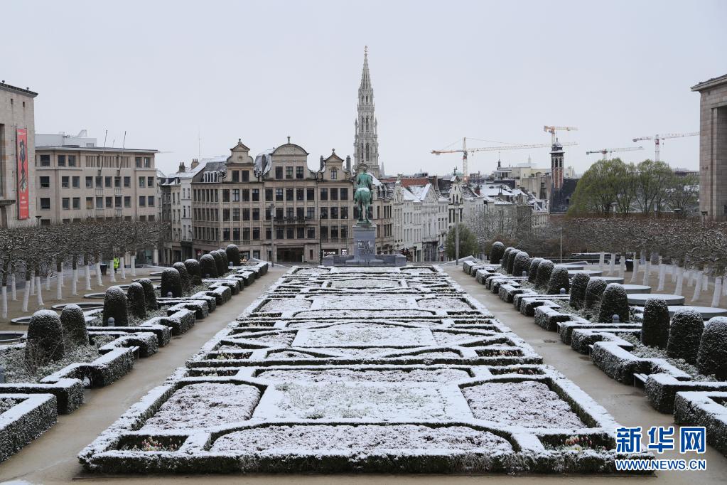 4月7日,比利时布鲁塞尔艺术山附近的花园被积雪覆盖。 比利时近日迎来春雪,首都布鲁塞尔银装素裹,景色别致。 新华社记者 郑焕松 摄