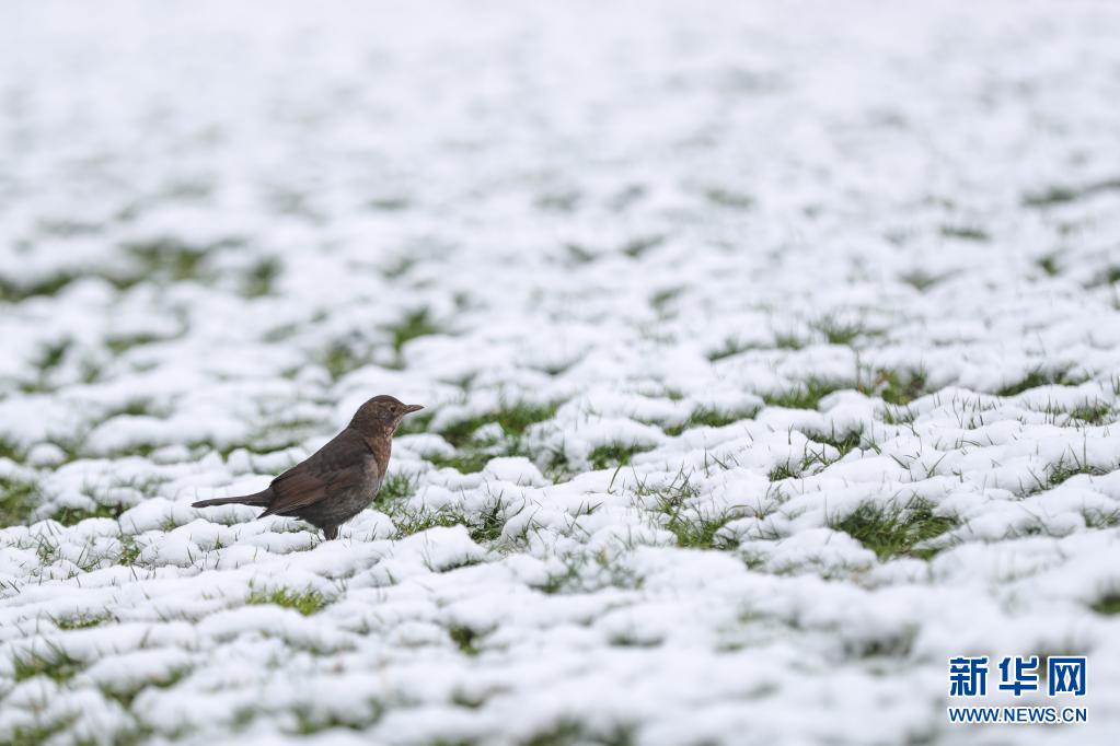 4月7日,一只鸟在比利时布鲁塞尔五十周年纪念公园积雪的草地上觅食。 比利时近日迎来春雪,首都布鲁塞尔银装素裹,景色别致。 新华社记者 郑焕松 摄