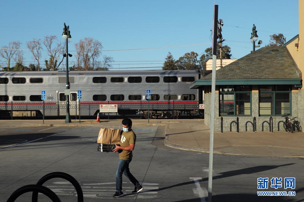 4月6日,一名行人拿着外卖走在美国加利福尼亚州北部小城圣马特奥的火车站前。
