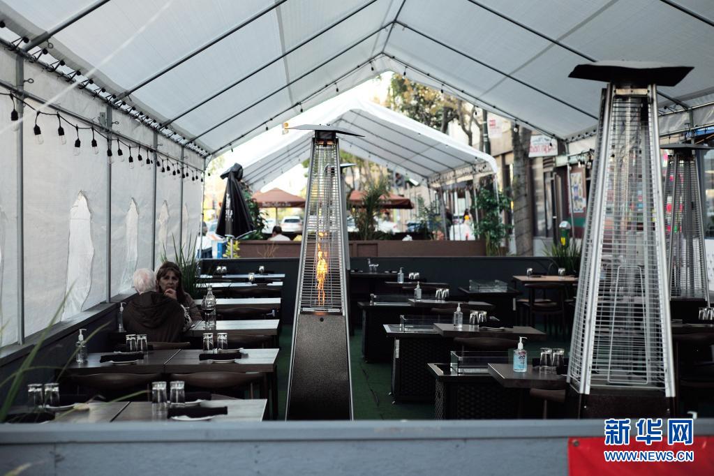 4月6日,人们在美国加利福尼亚州北部小城圣马特奥一家餐厅的户外就餐区用餐。新华社记者 吴晓凌 摄