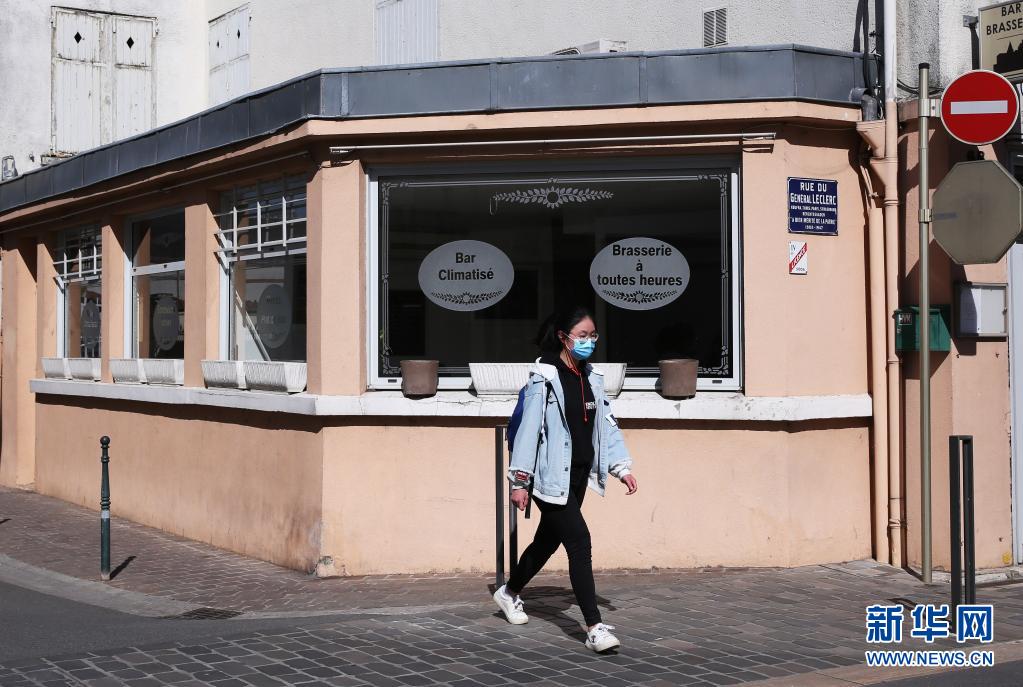 4月8日,在位于法国巴黎南部的蒙塔日,一名女子走过一家因疫情原因关门的餐馆。