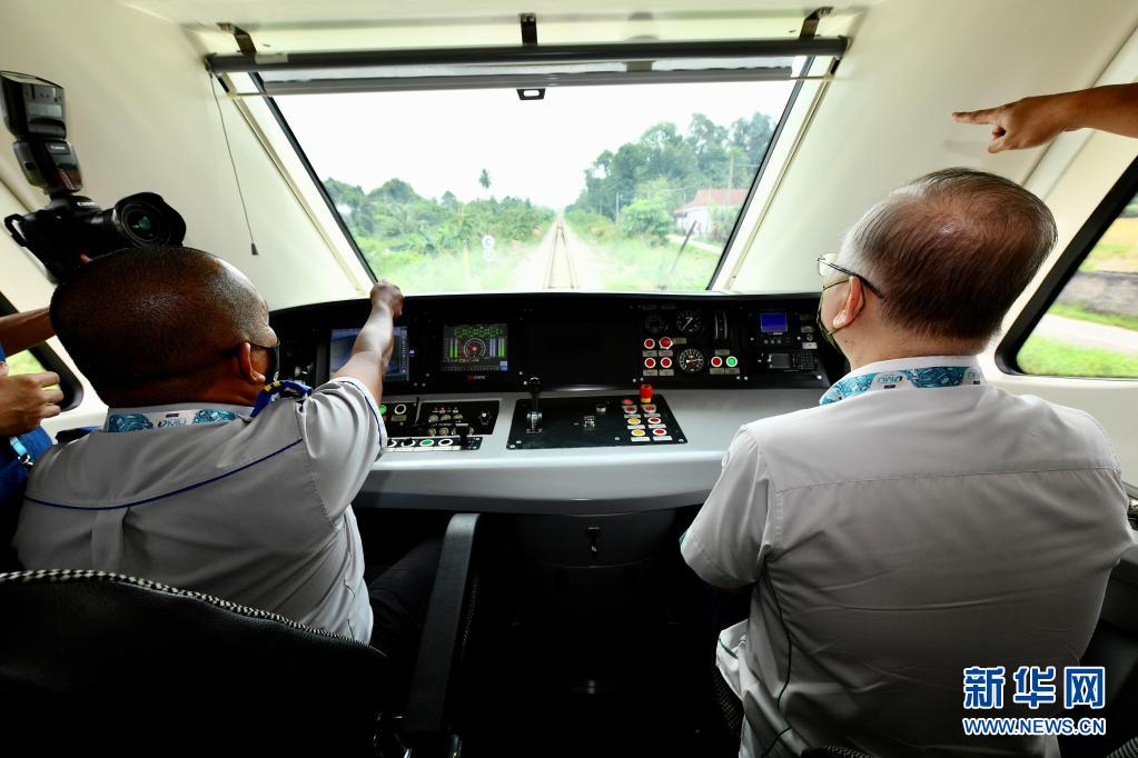 4月11日,在马来西亚吉兰丹州首府哥打巴鲁,马交通部长魏家祥(右)乘坐动车。