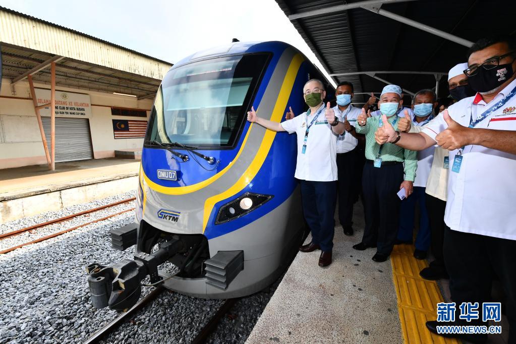 4月11日,在马来西亚吉兰丹州首府哥打巴鲁,马来西亚交通部长魏家祥(左)与动车合影。