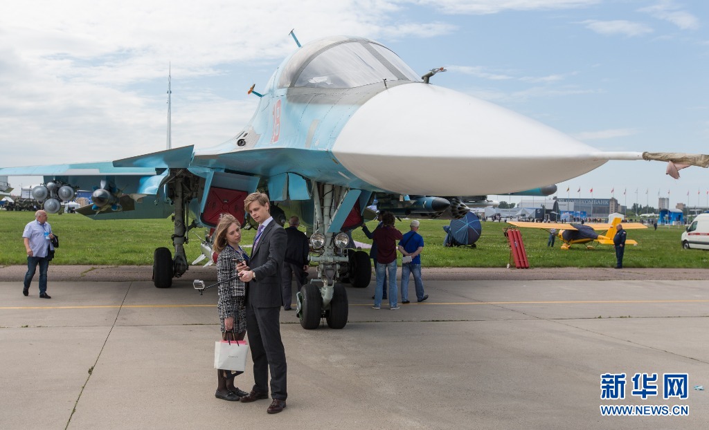 2017年7月18日,在俄罗斯首都莫斯科郊外的茹科夫斯基市,人们在苏-34战斗轰炸机前自拍。(新华社记者白雪骐摄)