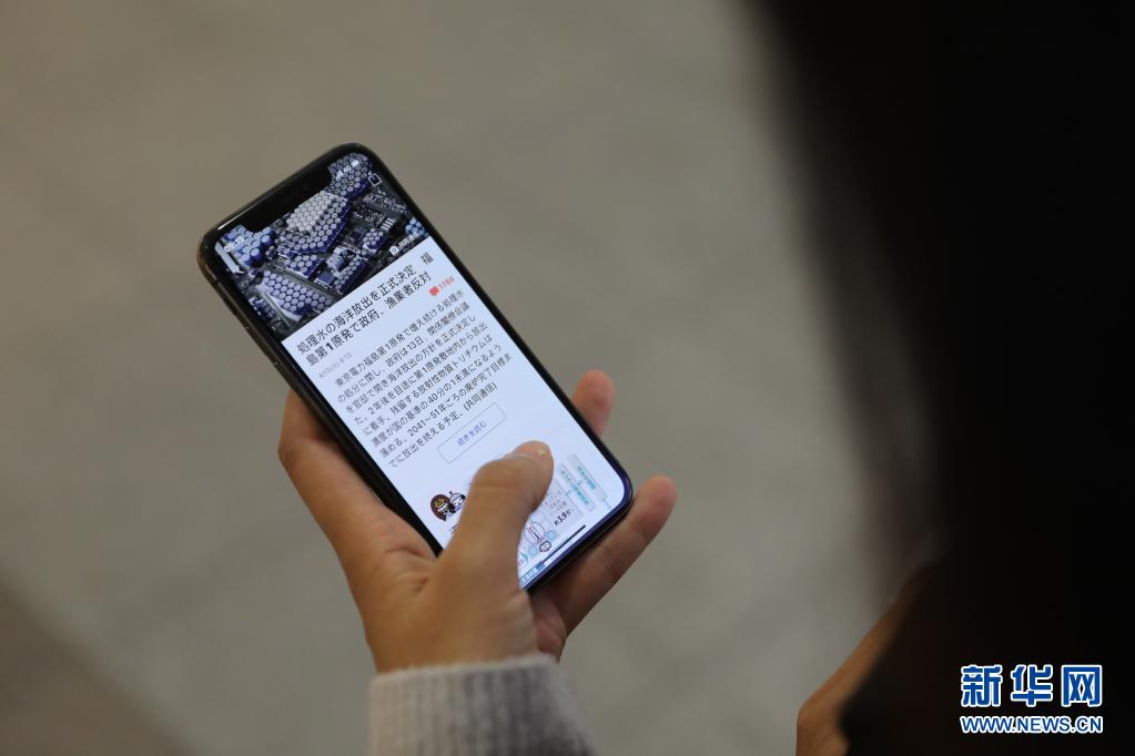 4月13日,一名市民在日本东京通过手机浏览日本决定将福岛核污水排入大海的新闻。