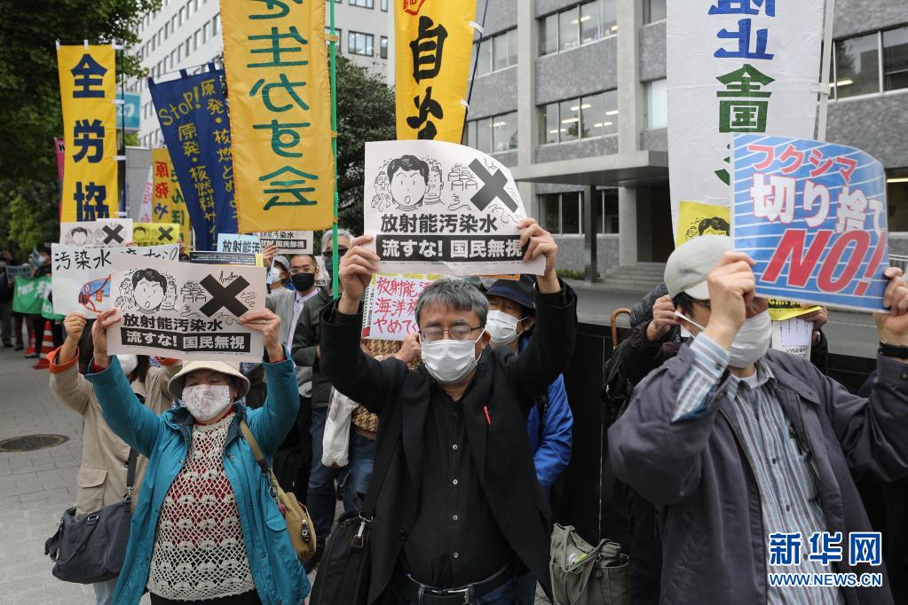 4月13日,抗议者在日本东京的首相官邸外反对福岛核污水排入大海。新华社记者 杜潇逸 摄