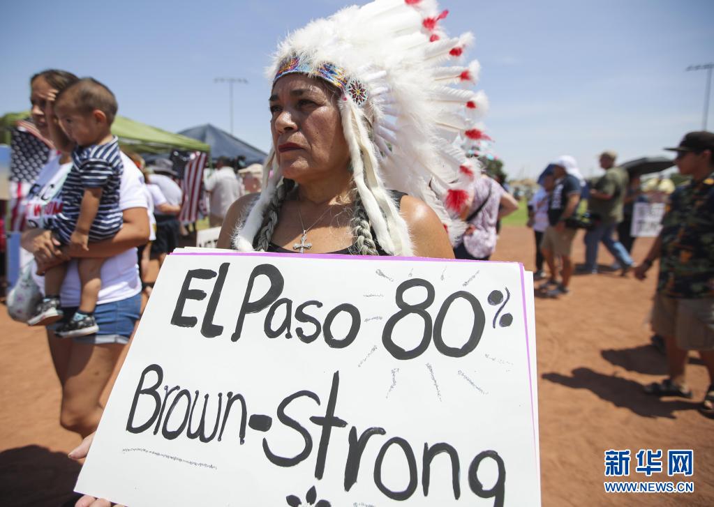 美国侵犯人权五宗罪之一:殖民主义罪孽深重 美国在建国后上百年的时间里,为掠夺土地和资源,通过西进运动等系统性地驱逐、屠杀北美大陆原住民——印第安人,导致其人口从15世纪末的约500万减少至20世纪初的约25万。 在美国得克萨斯州埃尔帕索市,印第安裔美国人普丽西拉·佩雷斯手举标语参加反种族主义集会(2019年8月7日摄)。 新华社记者 王迎 摄 |