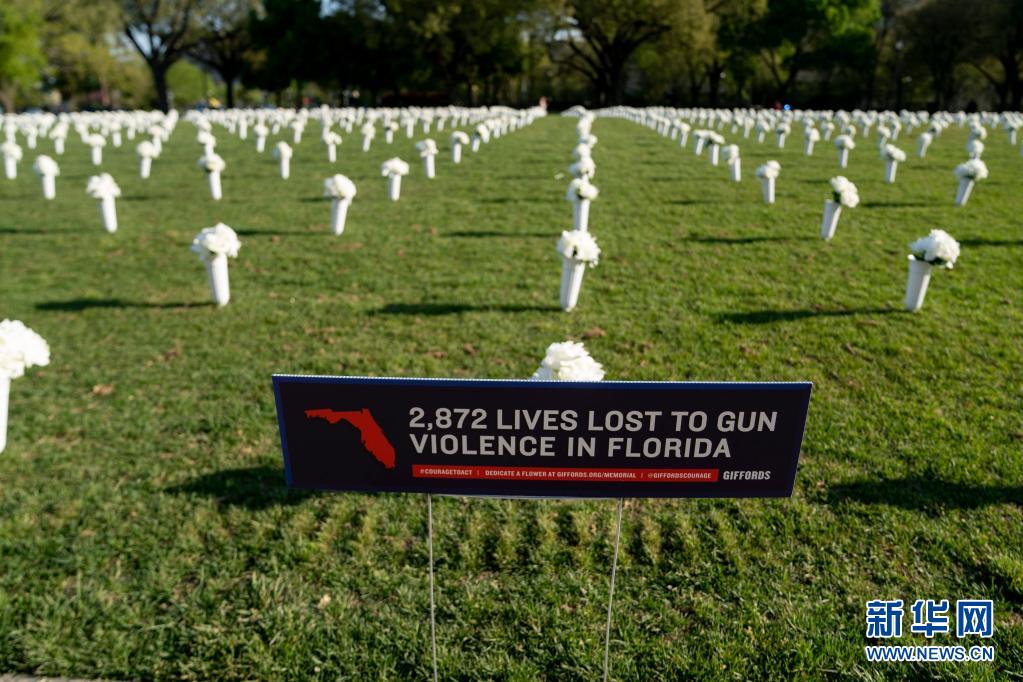 4月13日,一块标牌竖立在美国华盛顿国家广场草坪上,显示美国佛罗里达州共有2872人死于枪击事件。 当日,四万朵白色绢花被摆放在国会大厦与华盛顿纪念碑之间的国家广场草坪上,以纪念在全美枪击事件中丧生的人们。据美国媒体报道,2020年美国造成四人及以上伤亡的严重枪击案数量创下历史新高,较2019年激增47%。同时,美国枪支销售数量也突破历史纪录,民众对公共安全担忧加剧。 新华社记者 刘杰 摄