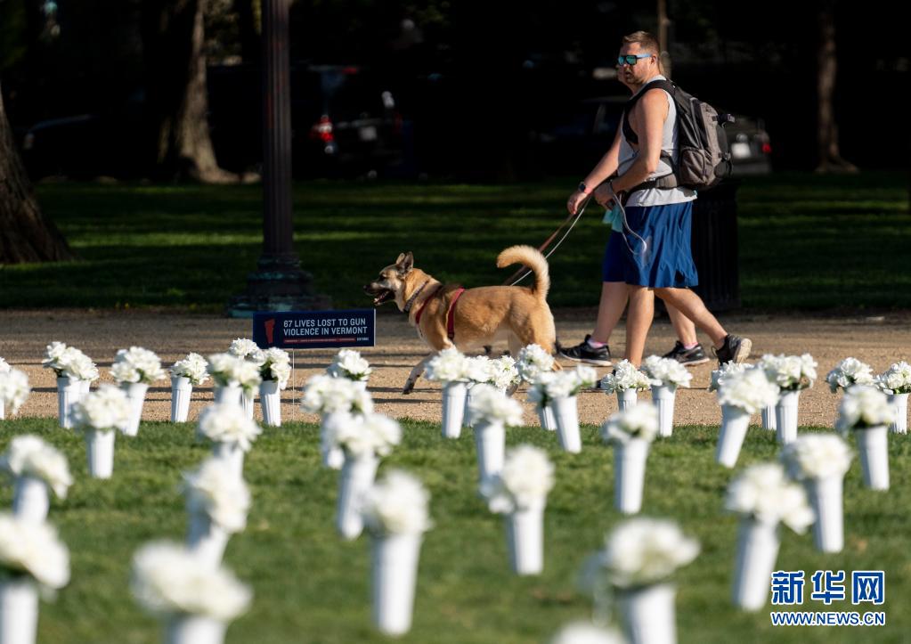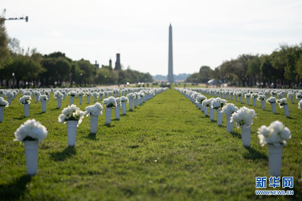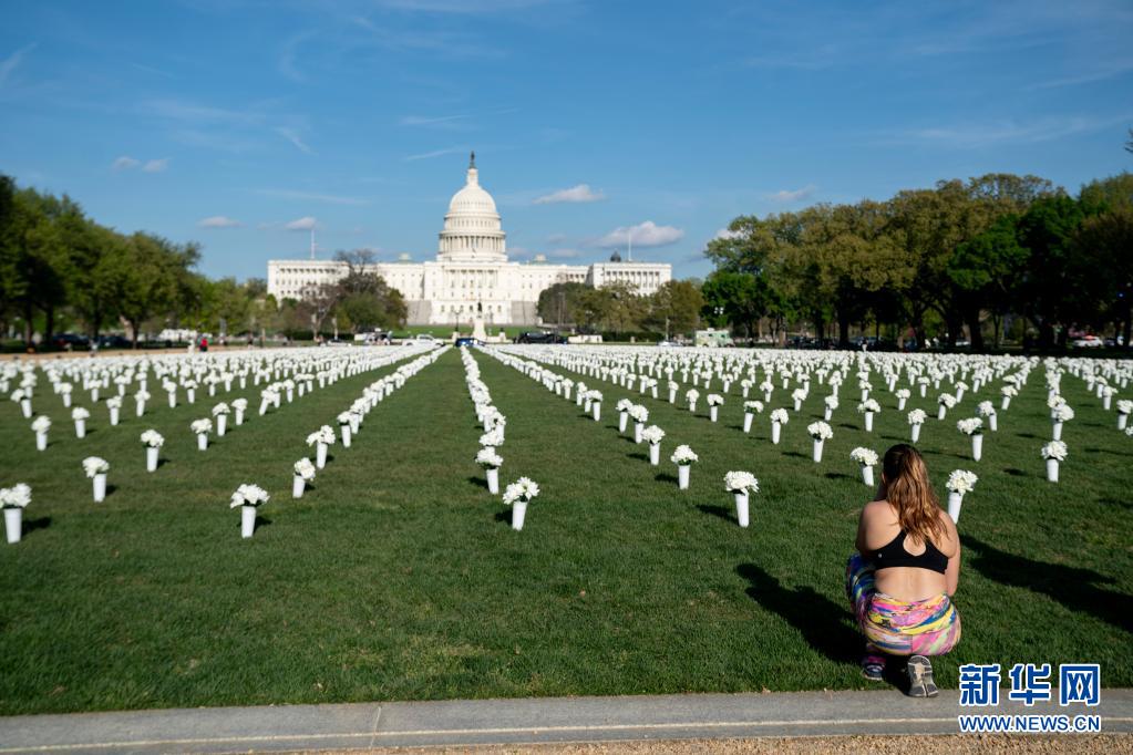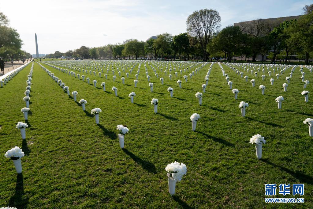 这是4月13日拍摄的美国华盛顿国家广场草坪上摆放的白色绢花。 当日,四万朵白色绢花被摆放在国会大厦与华盛顿纪念碑之间的国家广场草坪上,以纪念在全美枪击事件中丧生的人们。据美国媒体报道,2020年美国造成四人及以上伤亡的严重枪击案数量创下历史新高,较2019年激增47%。同时,美国枪支销售数量也突破历史纪录,民众对公共安全担忧加剧。 新华社记者 刘杰 摄
