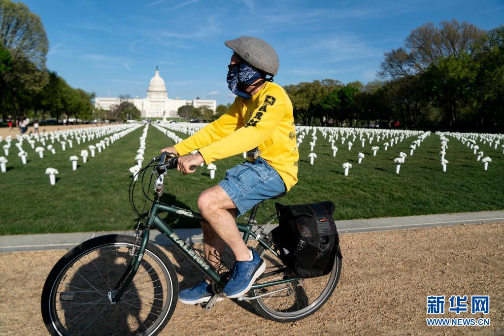 4月13日,一名男子骑车经过美国华盛顿国家广场草坪上摆放的白色绢花。 当日,四万朵白色绢花被摆放在国会大厦与华盛顿纪念碑之间的国家广场草坪上,以纪念在全美枪击事件中丧生的人们。据美国媒体报道,2020年美国造成四人及以上伤亡的严重枪击案数量创下历史新高,较2019年激增47%。同时,美国枪支销售数量也突破历史纪录,民众对公共安全担忧加剧。 新华社记者 刘杰 摄