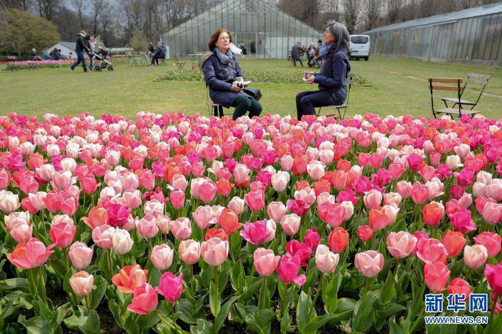 4月14日,参观者坐在比利时布鲁塞尔以西的拜加登城堡的鲜花旁休息聊天。