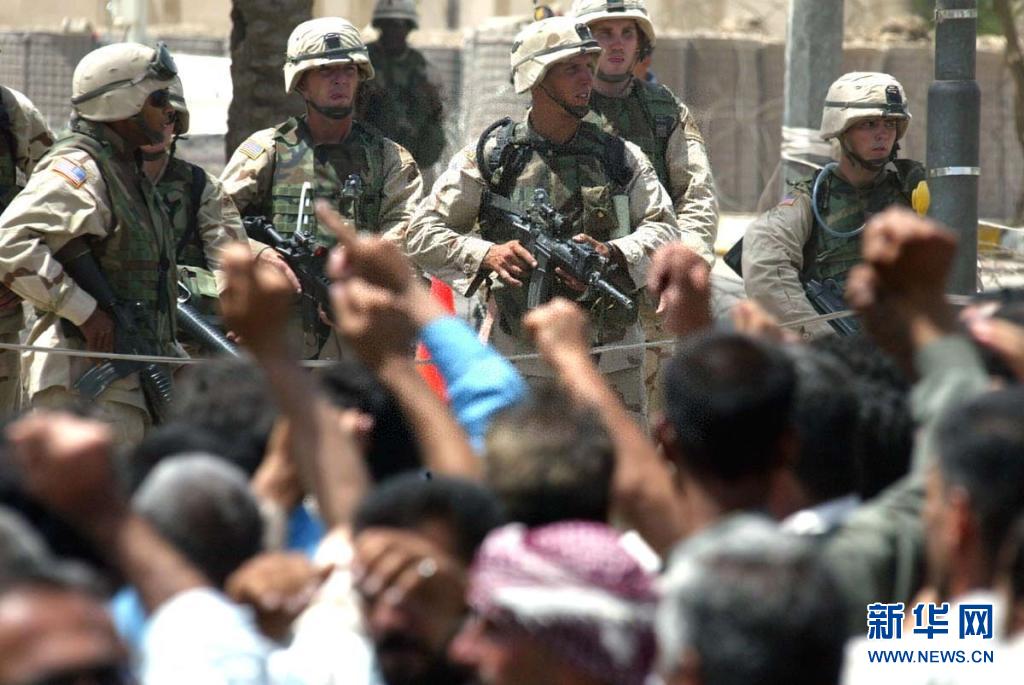 这是2003年6月18日,美军士兵在伊拉克首都巴格达美英联军临时总部门前持枪面对数百名示威的伊拉克人。
