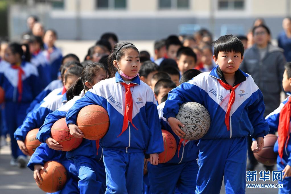 朝阳学校的学生们准备去操场上做篮球操(4月14日摄)。新华社记者 詹彦 摄