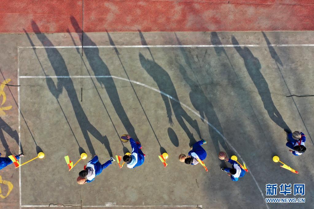 朝阳学校的学生们在课间进行篮球训练(4月13日摄,无人机照片)。新华社记者 詹彦 摄