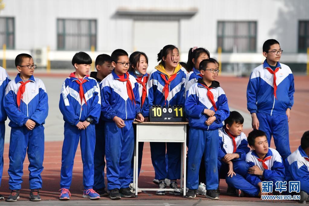 朝阳学校的学生们在场边为参加篮球比赛的队员加油(4月14日摄)。新华社记者 詹彦 摄