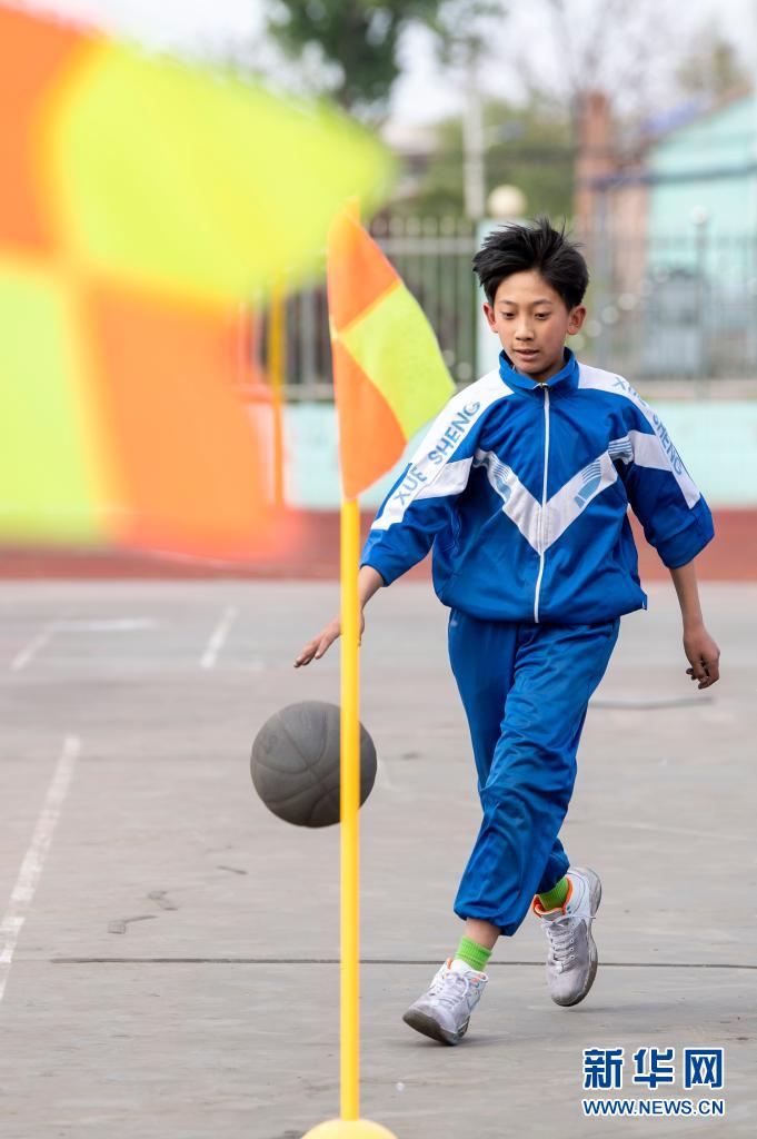 朝阳学校五年级学生孟昭旭在课间进行篮球训练(4月13日摄)。新华社记者 杨晨光 摄